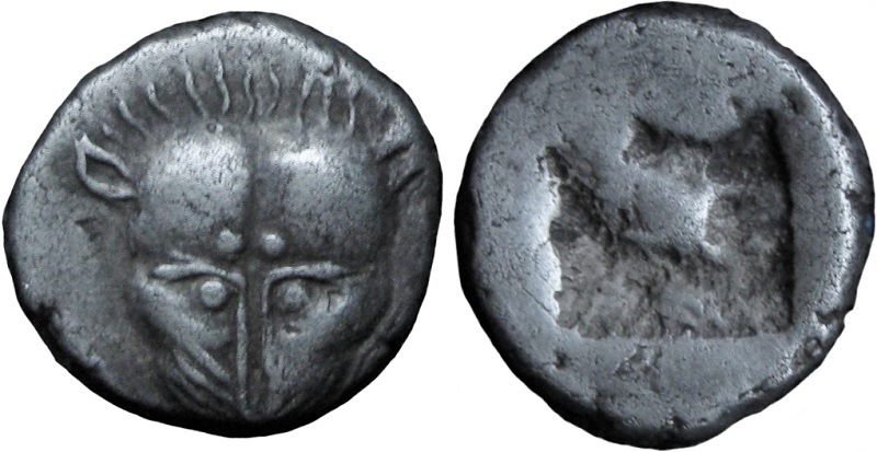 Период чеканки по Анохину В.А. выбран условно. ----------------------------------- По мнению Терещенко А.Е.: Серия Па–1. Конец третьей – середина последней четверти VI в. до н.э.