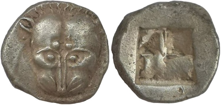 Период чеканки по Анохину В.А. выбран условно. ----------------------------------- По мнению Терещенко А.Е.: Серия Па–1. Конец третьей – середина последней четверти VI в. до н.э.