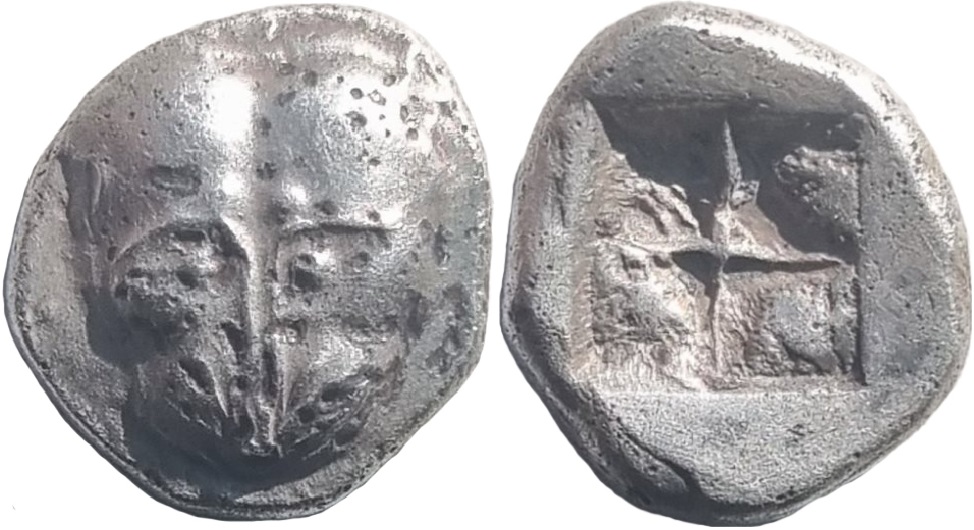 Период чеканки по Анохину В.А. выбран условно. ----------------------------------- По мнению Терещенко А.Е.: Серия Па–1. Конец третьей – середина последней четверти VI в. до н.э.
