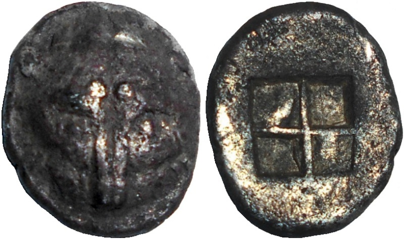 Период чеканки по Анохину В.А. выбран условно. --------------------------------- По мнению Терещенко А.Е.: Серия Па–2. Середина–конец последней четверти VI в. до н.э.