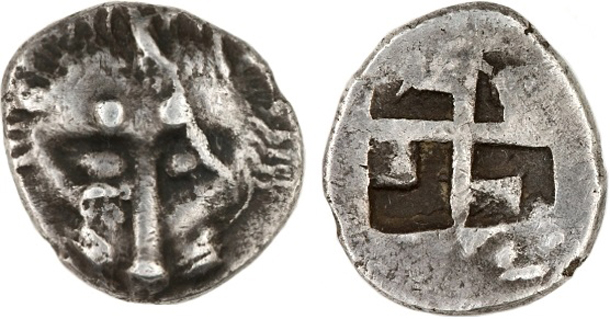 Монеты несут лицевой штемпель 000-2228. --------------------------- Период чеканки по Анохину В.А. выбран условно. --------------------------- По мнению Терещенко А.Е.: Серия Па–3. Конец VI в. до н.э. – начало второго десятилетия V в. до н.э.
