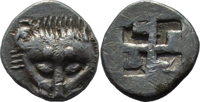 Монеты несут лицевой штемпель 000-2228. --------------------------- Период чеканки по Анохину В.А. выбран условно. --------------------------- По мнению Терещенко А.Е.: Серия Па–3. Конец VI в. до н.э. – начало второго десятилетия V в. до н.э.