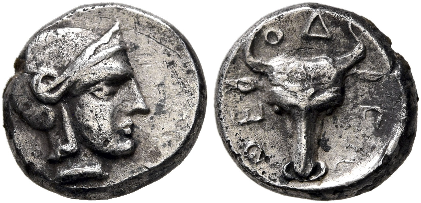 ГлавнаяКаталог монетПаспорт монеты Монета: 000-2112 Дополнительная информация о монете Leu Numismatik, Web Auction 26. Lot 931.Комментарий:Период чеканки монеты по Анохину В.А. (1986 г.) выбран условно. ------------ При чеканке использован лицевой штемпель типа 000-2227 Номер:000-2112 Количество монет в архиве:2 монет Центр чеканки:Феодосия Период чеканки: по Анохину В.А. (1986 г.)403 — 393 год до н.э. по Анохину В.А. (2011 г.)405 — 400 год до н.э. по Шелову Д.Б. по Фроловой Н.А. по MacDonald D. по Шонову И.В.407 — 405 год до н.э. Правитель, годы правления: Материал монеты:Серебро Номинал:Обол Вес монеты:1.11 Диаметр монеты:9.0 Описание аверса:Голова Афины в шлеме вправо Описание реверса:Голова быка в фас, без гирлянд (тений). По сторонам ΘΕ-ΟΔ-ΕΩ Номер по каталогу: Анохина В.А. (1986 г.)- Анохина В.А. (2011 г.)930 Шелова Д.Б.- Фроловой Н.А. MacDonald D. Шонова И.В.Таб. IX, № 103 Архив монет данного типа 000-2112-1 Феодосия. 403 — 393 год до н.э. Серебро Обол, вес 1.00 г, d0.0 мм 000-2112-2 Феодосия. 403 — 393 год до н.э. Серебро Обол, вес 1.11 г, d9.0 мм
