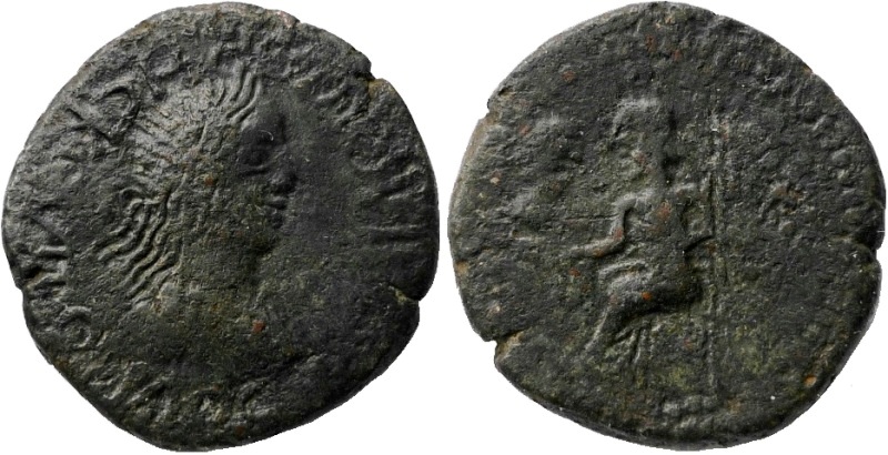 Богиня (Афродита Урания ?) на троне влево, в правой руке - сфера, в левой - длинный жезл.Справа от фигуры - *, слева бюст Септимия Севера в вправо