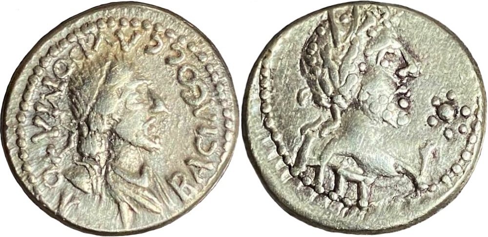 ГлавнаяКаталог монетПаспорт монеты Паспорт монеты: 000-4320-5 Дополнительная информация о монете Telegram messenger Группа Античная нумизматика, монеты БоспораКомментарий:Номер по каталогу В.А.Анохина дан справочно, так как монеты этого типа с такой разновидностью реверса ("звезда") в его каталоге не отмечены. Номер:000-4320 Количество монет в архиве:5 монет Центр чеканки:Пантикапей Период чеканки: по Анохину В.А. (1986 г.)191 — 192 год н.э. по Анохину В.А. (2011 г.)191 — 192 год н.э. по Шелову Д.Б. по Фроловой Н.А. по MacDonald D.191 — 192 год н.э. по Шонову И.В. Правитель, годы правления:Савромат II, 174/175 - 210/211 гг. Материал монеты:Электр Номинал:Статер Вес монеты:0.00 Диаметр монеты:0.0 Описание аверса:ΒΑCΙΛΕωC CΑΥΡΟΜΑΤΟΥ. Бюст Савромата II вправо Описание реверса:Бюст императора Коммода вправо, год НПY (488 г. б.э.), справа звезда Номер по каталогу: Анохина В.А. (1986 г.)569 Анохина В.А. (2011 г.)1789 Шелова Д.Б.- Фроловой Н.А. MacDonald D.499 Шонова И.В. Архив монет данного типа 000-4320-1 Пантикапей. 191 — 192 год н.э. Электр Статер, вес 7.79 г, d0.0 мм 000-4320-2 Пантикапей. 191 — 192 год н.э. Электр Статер, вес 7.80 г, d0.0 мм 000-4320-3 Пантикапей. 191 — 192 год н.э. Электр Статер, вес 7.75 г, d19.0 мм 000-4320-4 Пантикапей. 191 — 192 год н.э. Электр Статер, вес 7.57 г, d0.0 мм 000-4320-5 Пантикапей. 191 — 192 год н.э. Электр Статер, вес 0.00 г, d0.0 мм