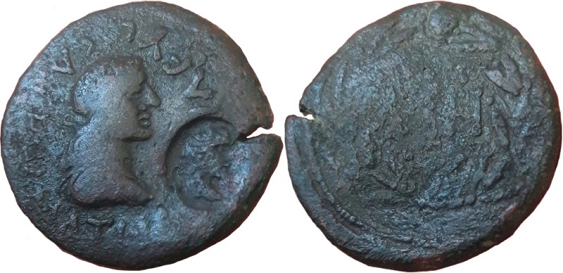 Монета отчеканенена при Савромате I и принадлежит типу 445-4498, но из-за позднего наложения надчекана "голова Септимия Севера" данная монета нами включена в период чеканки Савромата II. Номер по каталогу Анохина В.А. 1986г. дан справочно.