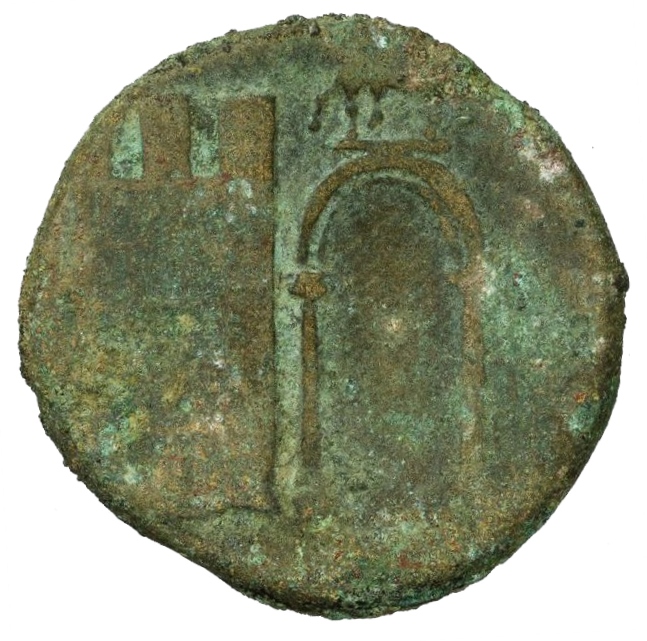 ΤΙΒΕΡΙΟC ΙΟΥΛΙΟC ΒΑCΙΛΕΥC ΡΗCΚΟΥΠΟΡΙC. Царь, попирающий пленника, вправо. Слева - второй пленник, справа - трофей