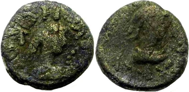 Бюст императора вправо, внизу год ΛΙΧ (611 г. б.э.), «двузубец»
