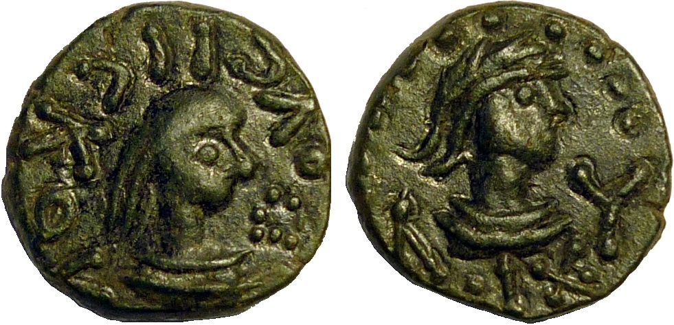 Бюст императора вправо, внизу год ΛΙΧ (611 г. б.э.), «двузубец»