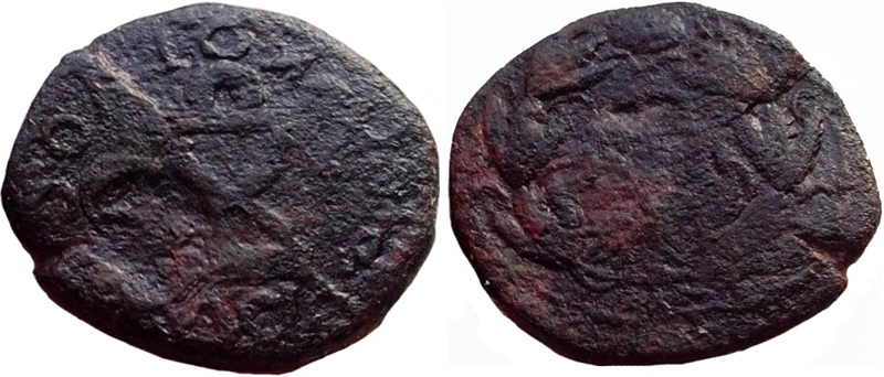 Монета отчеканенена при Котисе II и принадлежит типу 482-4034, но из-за позднего наложения надчекана "голова Септимия Севера" данная монета нами включена в период чеканки Савромата II. Номер по каталогу Анохина В.А. дан справочно.