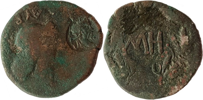 Монета отчеканенена при Савромате I и принадлежит типу 454-4173, но из-за позднего наложения надчекана "голова Септимия Севера" данная монета нами включена в период чеканки Савромата II. Номер по каталогу Анохина В.А. 1986г. дан справочно.