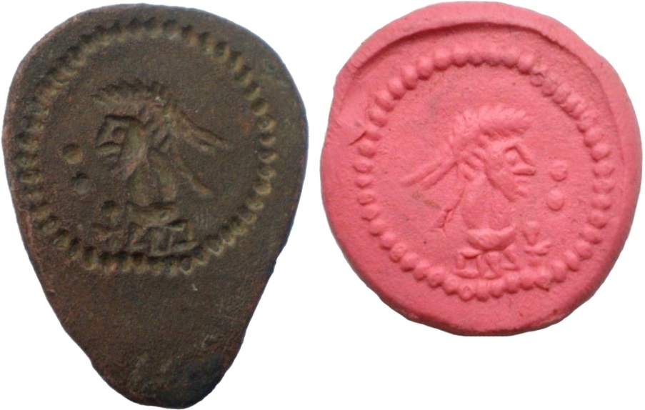 Штемпель подражания реверса статера Рискупорида IV и его оттиск. ------------- Данный предмет вводится в научный оборот впервые в Каталоге- Архиве "Монеты Боспора". ------------- Номер по каталогу Анохина В.А. (1986 г.) дан справочно.