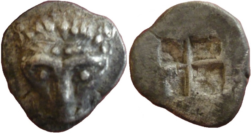 Период чеканки согласно Анохину В.А. выбран условно, так как период чеканки 500-490 гг до н.э. указанный в его каталоге 1986 г. мы, исходя из особенностей чеканки данного периода, считаем неверным. ------------------------------ По мнению Терещенко А.Е.: Серия Па–2. Середина–конец последней четверти VI в. до н.э.