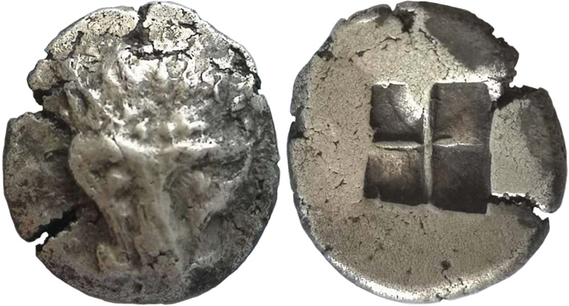 Период чеканки согласно Анохину В.А. выбран условно, так как период чеканки 500-490 гг до н.э. указанный в его каталоге 1986 г. мы, исходя из особенностей чеканки данного периода, считаем неверным. ------------------------------ По мнению Терещенко А.Е.: Серия Па–2. Середина–конец последней четверти VI в. до н.э.