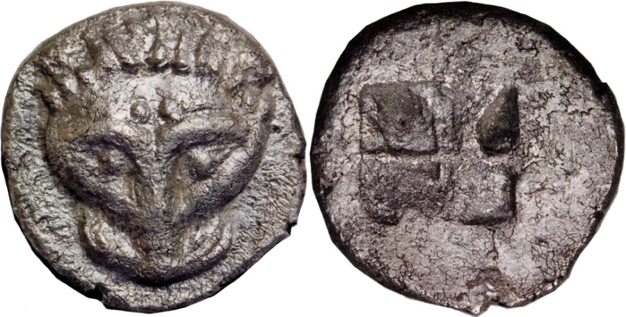 Период чеканки согласно Анохину В.А. выбран условно, так как период чеканки 500-490 гг до н.э. указанный в его каталоге 1986 г. мы, исходя из особенностей чеканки данного периода, считаем неверным. ------------------------------ По мнению Терещенко А.Е.: Серия Па–2. Середина–конец последней четверти VI в. до н.э.