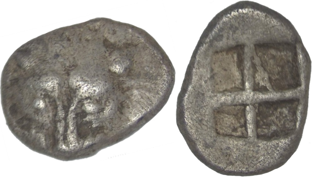 Период чеканки по Анохину В.А. выбран условно. ----------------------------- По мнению Терещенко А.Е.: Серия Па–2. Середина–конец последней четверти VI в. до н.э.
