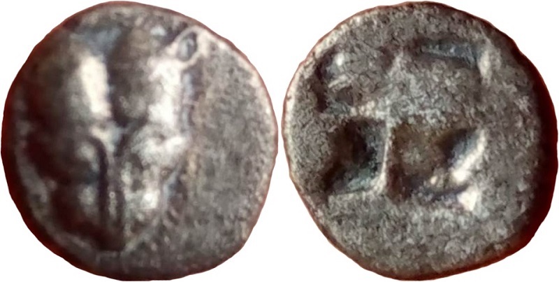 Период чеканки согласно Анохину В.А. выбран условно, так как период чеканки 500-490 гг до н.э. указанный в его каталоге 1986 г. мы, исходя из особенностей чеканки данного периода, считаем неверным. ------------------------------ По мнению Терещенко А.Е.: Серия Па–2. Середина–конец последней четверти VI в. до н.э.