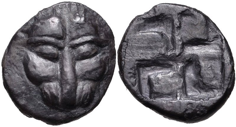 При чеканке некоторых монет данного типа использован лицевой штемпель 015-1018. -------------- По мнению Терещенко А.Е.: Серия Па–3. Конец VI в. до н.э. – начало второго десятилетия V в. до н.э.