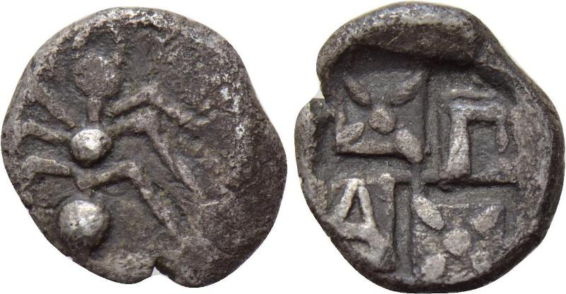 Т.к. при построении каталога-архива за основу взят каталог Анохина В.А. 1986г., в котором данный тип монет отнесён к чеканке храма Аполлона, администрация сайта данные монеты также включила к чекану этого центра. Но, мы ни в кой мере не хотим навязывать посетителям нашего ресурса подобную точку зрения. Сохраняя нейтралитет в данном вопросе, считаем необходимым перечислить основные гипотезы по локализации центра эмиссии: - Чекан храмом Аполлона монеты для своих нужд. - Чекан конфедерации боспорских городов под эгидой храма Аполлона. - Чеканка автономного эмиссионного центра.