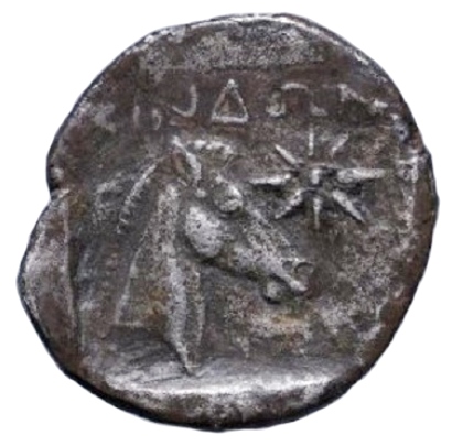 Вдавленный квадрат с головой коня вправо. Вверху надпись ΣINΔΩN, ниже справа - восьмилучевая звезда