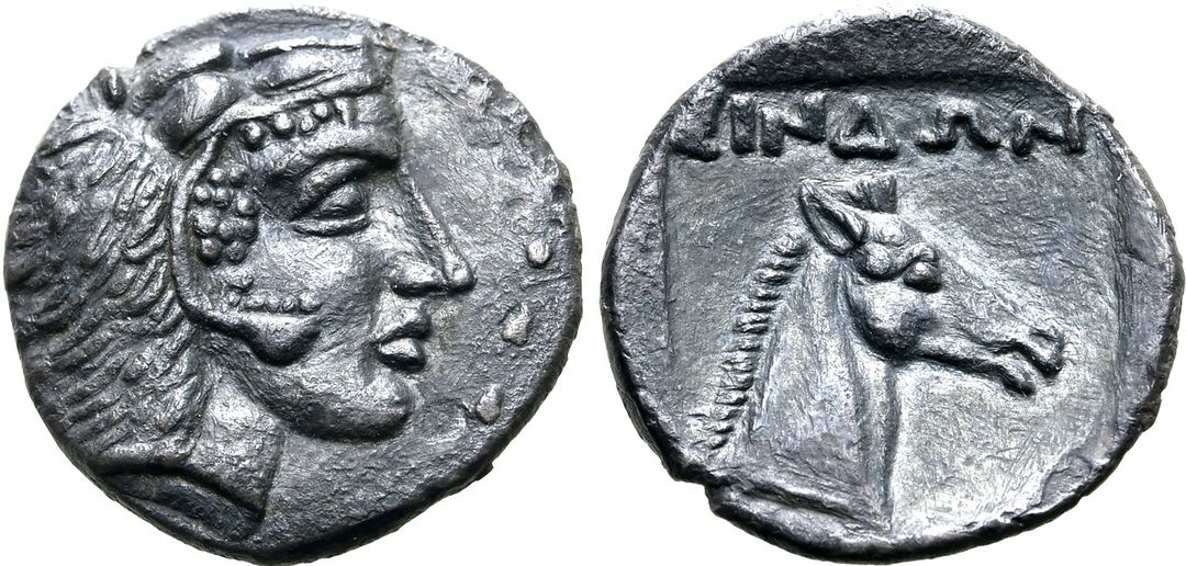 - Вдавленный квадрат с головой коня вправо. Вверху надпись ΣINΔΩN