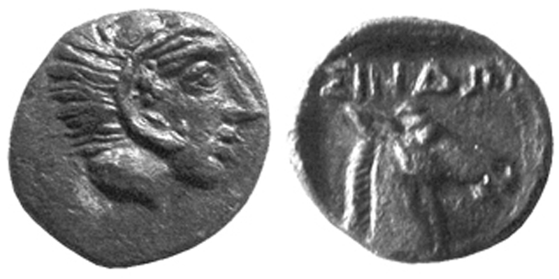 Вдавленный квадрат с головой коня вправо. Вверху надпись ΣINΔΩN
