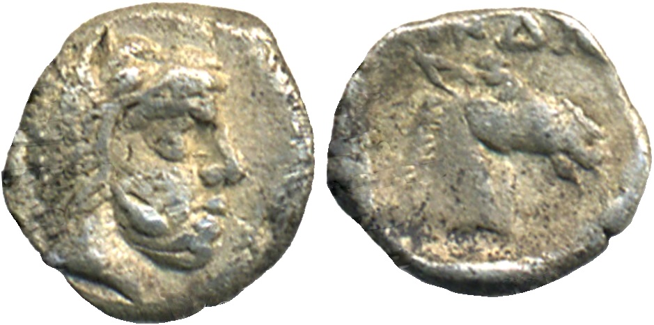 Вдавленный квадрат с головой коня вправо. Вверху надпись ΣINΔΩN
