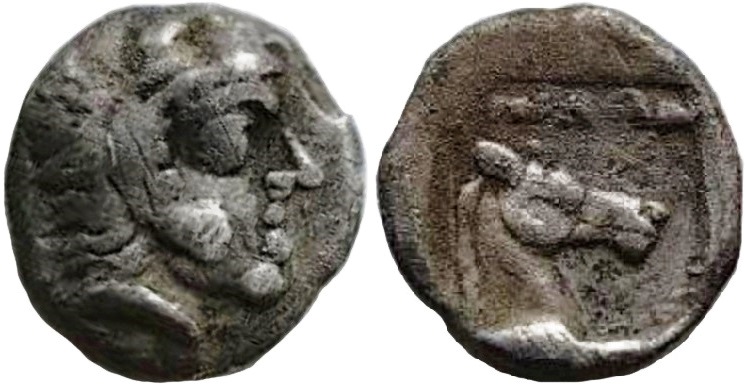 Вдавленный квадрат с головой коня вправо. Вверху надпись ΣINΔΩN