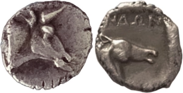 Вдавленный квадрат с головой коня вправо. Вверху надпись ΣINΔΩN