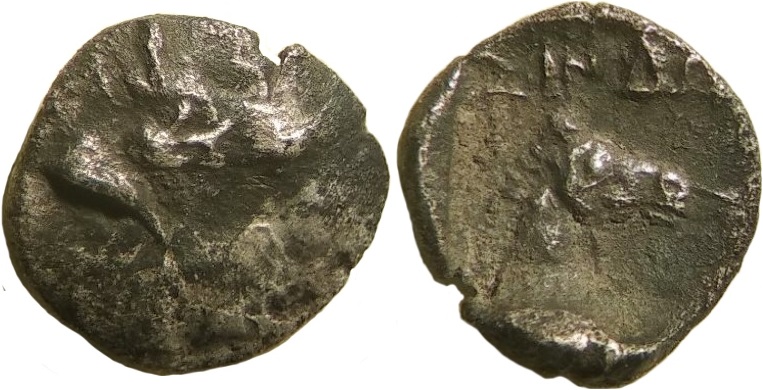Вдавленный квадрат с головой коня вправо. Вверху надпись ΣINΔΩN