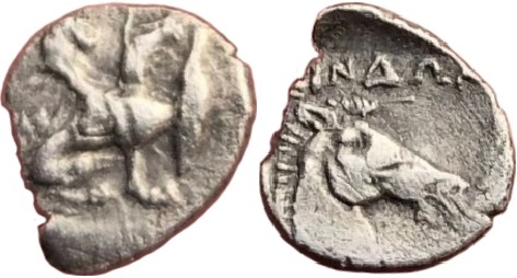 Номера по каталогам (1986г. и 2011г.) Анохина В.А. даны условно, так как данный тип с легендой ΣINΔΩN, а не ΣIN в его каталогах не представлен. ----------------------------------- По мнению Терещенко А.Е.: Серия С-3. Последнее десятилетие V в. до н.э. – первая четверть IV в. до н.э. (период около 380 г. до н.э.?)