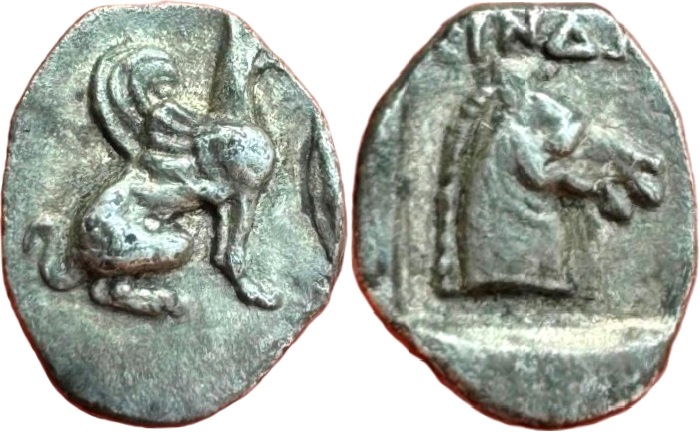 Номера по каталогам (1986г. и 2011г.) Анохина В.А. даны условно, так как данный тип с легендой ΣINΔΩN, а не ΣIN в его каталогах не представлен. ----------------------------------- По мнению Терещенко А.Е.: Серия С-3. Последнее десятилетие V в. до н.э. – первая четверть IV в. до н.э. (период около 380 г. до н.э.?)