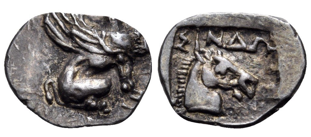 Номера по каталогам (1986г. и 2011г.) Анохина В.А. даны условно, так как данный тип с легендой ΣINΔΩN, а не ΣIN в его каталогах не представлен. ----------------------------------- По мнению Терещенко А.Е.: Серия С-3. Последнее десятилетие V в. до н.э. – первая четверть IV в. до н.э. (период около 380 г. до н.э.?)