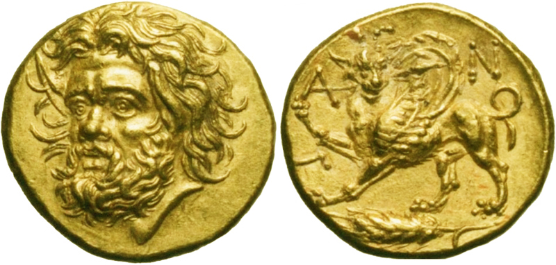 ПАN. Грифон с копьем в пасти влево, внизу колос