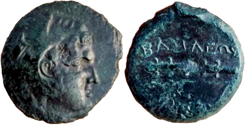- Палица, под ней лук тетивой вверх. Надпись в две строки: сверху- ΒΑΣΙΛΕΩΣ, внизу - ΛΕΥΚΩΝΟΣ