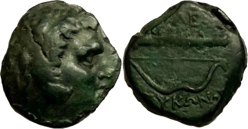 - Палица, под ней лук тетивой вверх. Надпись в две строки: сверху- ΒΑΣΙΛΕΩΣ, внизу - ΛΕΥΚΩΝΟΣ