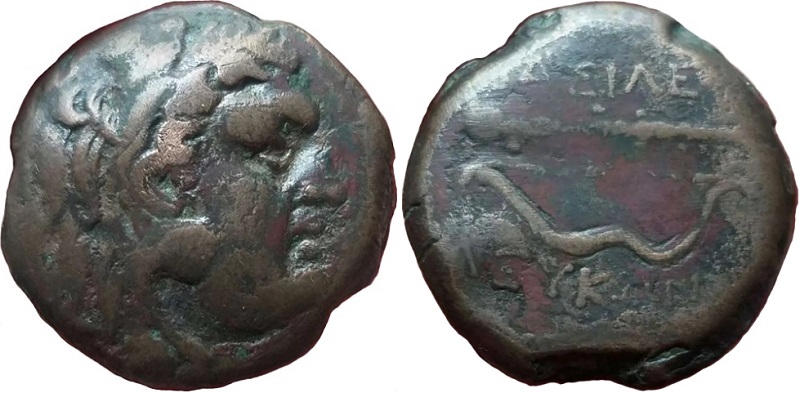 - Палица, под ней лук тетивой вверх. Надпись в две строки: сверху- ΒΑΣΙΛΕΩΣ, внизу - ΛΕΥΚΩΝΟΣ