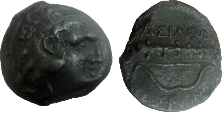 - Палица, под ней лук тетивой вверх. Надпись в две строки: сверху- ΒΑΣΙΛΕΩΣ, внизу - ΛΕΥΚΩΝΟΣ