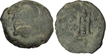 Голова безбородого сатира в венке вправо. Надчеканка "треножник - ПАN"