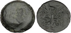 Голова безбородого сатира в венке вправо. Надчеканка "треножник - ПАN"