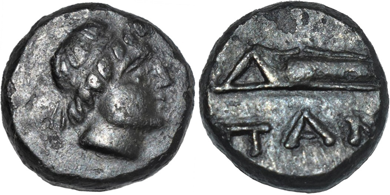 - Голова Аполлона в венке вправо
