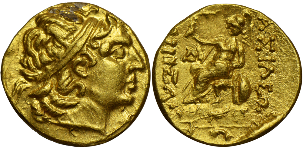 ΒΑΣΙΛΕΩΣ ΠΑΙΡΙΣΑΔΟΥ. Сидящая влево Афина держит в вытянутой правой руке фигурку Ники, левой рукой опирается на щит; в поле слева-ΔΙ, внизу трезубец влево