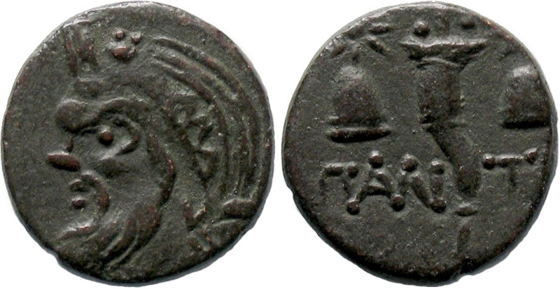 - ΠΑΝ-ΤΙ. Рог изобилия между шапками Диоскуров.