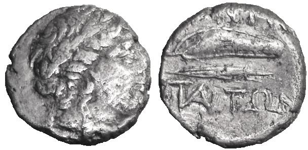 - Голова Аполлона в венке вправо
