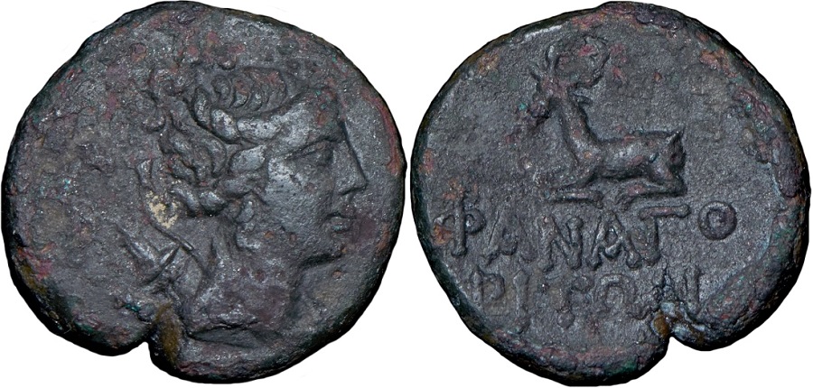 Голова Артемиды вправо, слева за плечом лук в колчане