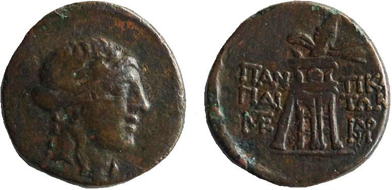 - ΠΑΝ-ΤΙΚΑ-ΠΑΙ-ΤΩΝ. Треножник и тирс, в поле справа и слева монограммы