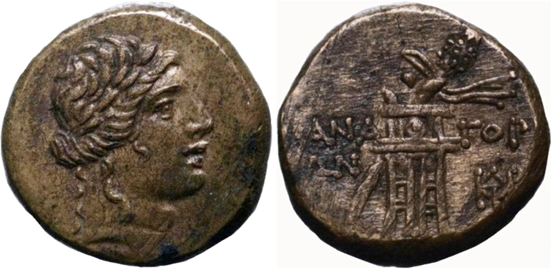 ΦΑΝΑ-ΓΟΡΙ-ΤΩΝ. Треножник и тирс, справа монограмма