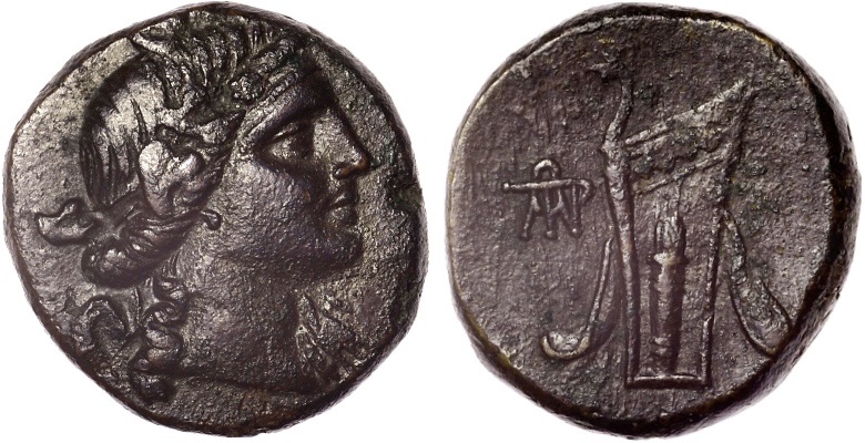 - Голова Диониса в плющевом венке вправо.
