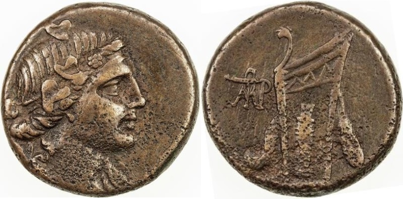 - Голова Диониса в плющевом венке вправо.