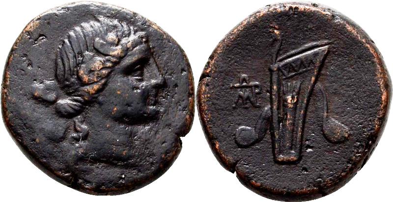 - Голова Диониса в плющевом венке вправо.